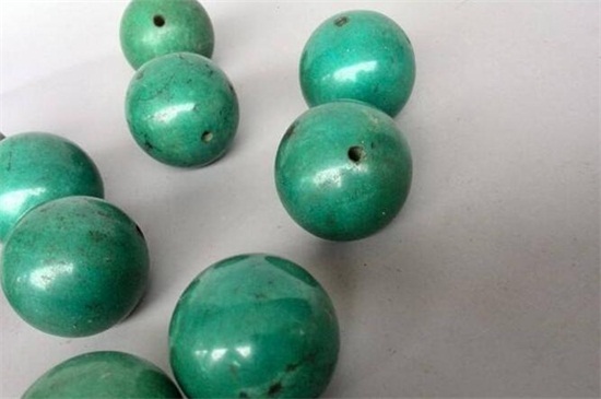 在鉴别绿松石与菱镁矿的过程中可以从颜色上进行区分,一般染色后的菱镁矿颜色分布有不均匀的情况,在许多地方还是可以找到发白的颜色,而绿松石的颜色看起来均匀单一,整体看起来也会比较透亮。