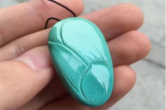 而中等的绿松石颜色一般以深蓝、蓝绿、翠绿色等颜色居多,它们显著的特点就是光泽性很强,带一点透明感,质地比较坚韧,铁线或其他缺陷很少,块度中等,对于蓝色的会稍逊一筹。