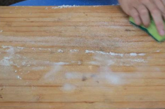 先把案板放置在流动的水下冲洗,将表面看得见的杂质冲洗干净之后,蘸取少量食盐充分涂抹在案板上,静置30分钟之后用海绵擦拭案板。