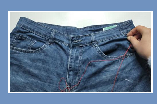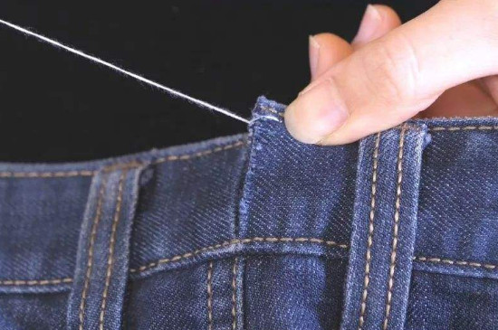 选用细针慢慢将内里缝制好,如果是使用粗针的话,裤腰容易松垮。缝制时要找一个与裤腰差不多颜色的线,将裤腰先翻面,从里面先行缝制;在裤腰中线那里,可以稍微缝紧一点,如果是宽松的裤子,需要比较大弹力的话,就无需缝紧。