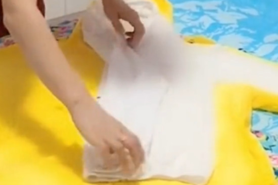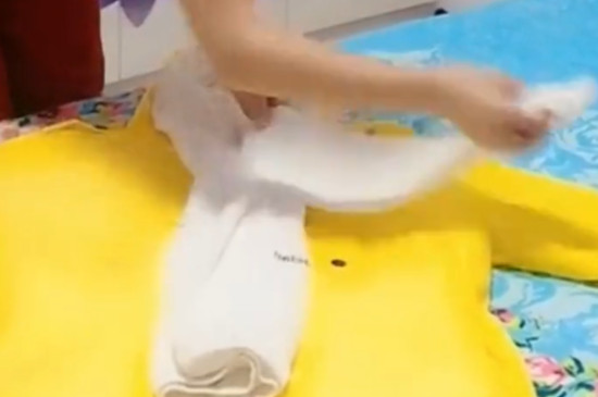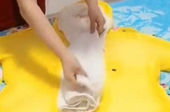 3、再把衣服翻转过来,让下面那一层在上面,再把袖子以同样的方式翻折。