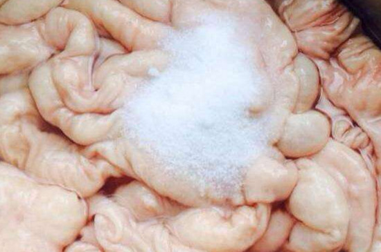 肥肠表面有一层粘液,使用食盐清洗能有效将粘液去除。将肥肠中撒上两把食盐,用双手将食盐与肥肠充分抓洗干净,食盐的颗粒可以加大肥肠的摩擦力,能清洗的更加干净。