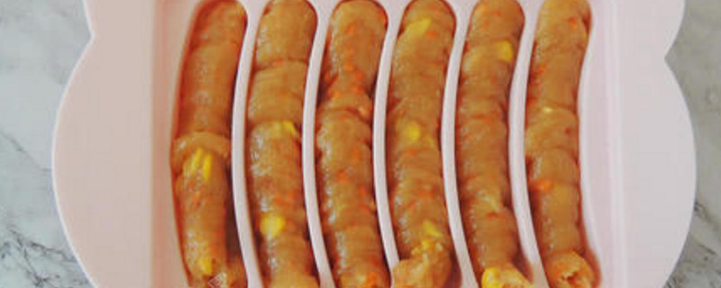 用模具制作香肠,首先需要将淀粉和胡萝卜丁、虾仁、蛋清混合在一起,其中的虾仁和胡萝卜丁可以替代成其它自己喜欢的食物,再将搅拌均匀的食材倒入模具内,放在锅内用大火蒸15~20分钟左右,就可以取出食用。
