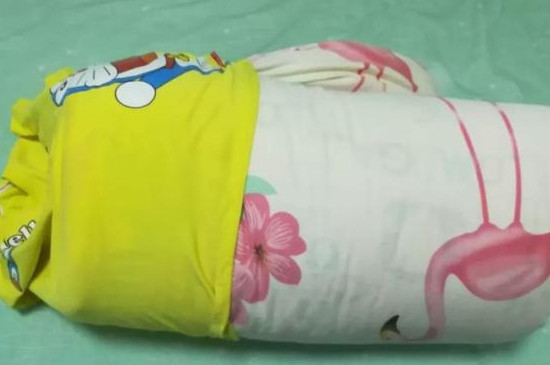 将被子铺开,两侧向中间对折1/4两次,被子会呈长方形,再将被子一头卷起来,直到整个被子呈圆柱状,再把旧衣服套在上面,如果有袖子还可以用袖子捆绑一下会更加牢固。