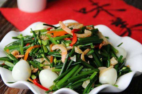 将鹌鹑蛋用冷水煮开剥壳备用,把韭菜洗干净之后并切成段。热油下锅,用小火把鹌鹑蛋煎黄,再加入韭菜翻炒,此时可以把火改为大火。韭菜变软了之后就可以加入少量的食盐、生抽进行调味,最后起锅装盘就可以了。