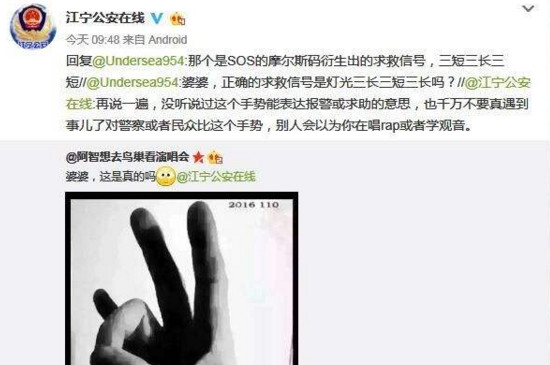 江宁公安在微博声称若是遇到危险时,摆出这个手势,警察以及公安人民只会认为是在唱rap,所以遇到事情千万不要摆这个手势。