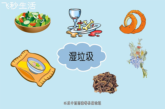 湿垃圾指食材废料、剩菜剩饭、瓜皮果核、过期食品、花卉绿植以及中药药渣等易腐垃圾,投放时要求将湿垃圾的包装物去除按照分类投放可回收垃圾或是干垃圾中。