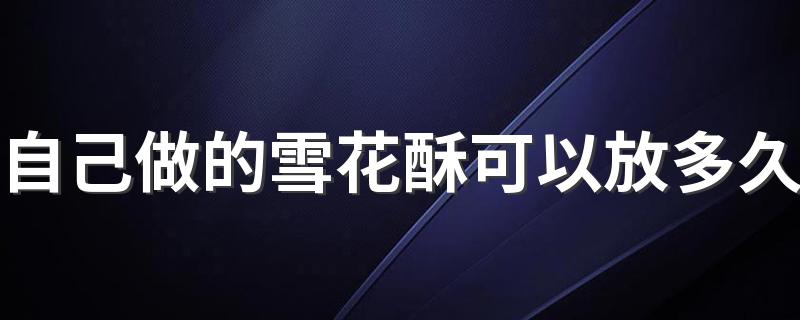 自己做的雪花酥在常温,不受潮的情况下可以保存10-15天。雪花酥是一种甜点,在家使用棉花糖就可以制作,制作过程中加入小饼干、干果、坚果即可,放入的小饼干要硬一些,不要使用酥的饼干进行制作。