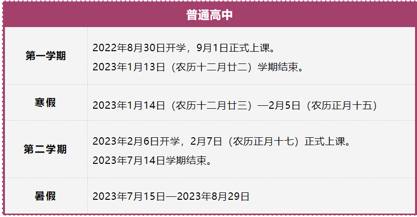 普通高中:2023 年 1 月 16 日学期结束,寒假从 2023 年 1 月 17 日(农历十二月二十六)至 2月 6 日(农历正月十六)。