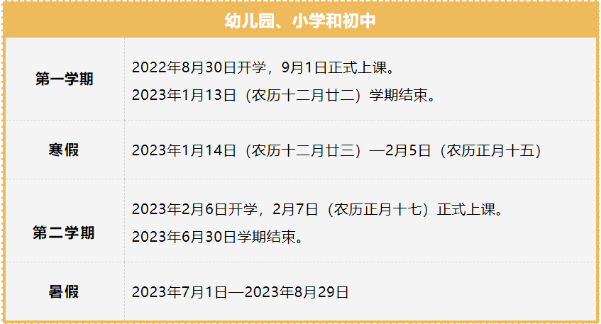 普通中学:2023年1月14日(农历十二月廿三)学期结束,2023年2月6日(农历正月十六)开学。
