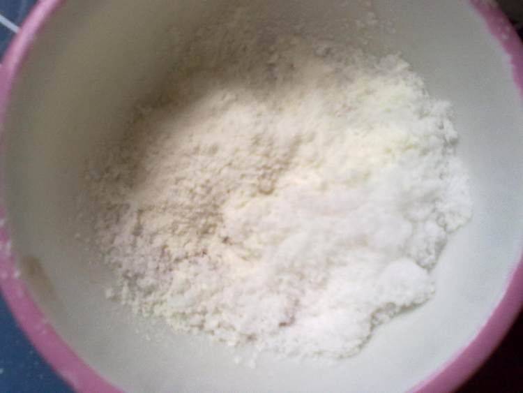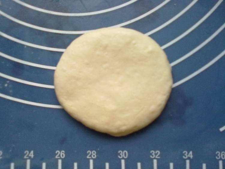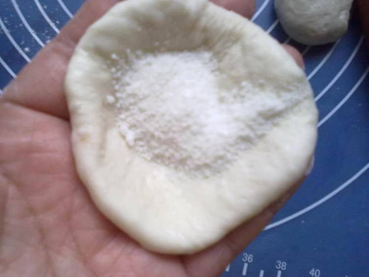 5、把一个剂子在手上按扁,放入一勺调好的白糖粉。