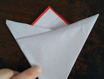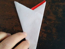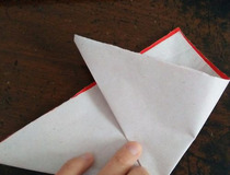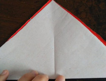 先把红纸正面向里,红纸的对角线对折,然后再左右中线对折一下,要折痕。