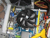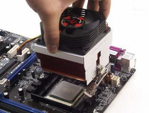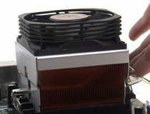 当两端扣具全部打开之后,就可以将CPU散热器慢慢取下。这里需要注意的一点是,由于散热硅脂有可能将CPU和散热器底部金属粘在一起,所以取下CPU散热器的时候一定要垂直取下,以避免将CPU脆弱的针脚弄弯。
