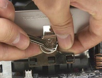 拆卸CPU散热器时首先要将金属扣具拉起至另一端。
