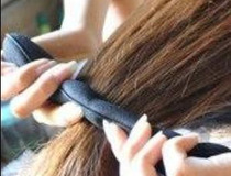 将头发套进海绵棒中间的洞,从发尾处慢慢往上卷。