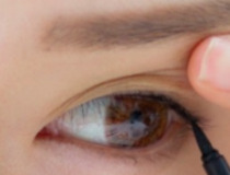 画内眼线,用左手按于眼角处,将眼角向上拉,可以清楚看见睫毛根部时,用眼线笔先将睫毛根部描黑,一定要全黑,不能露白。