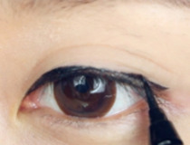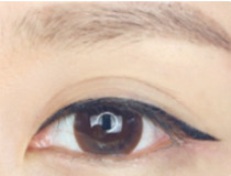 画外眼线,左手不用提拉眼皮,正常睁开,沿着睫毛根部外侧细细画一条眼线,眼尾适当拉长。