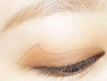 沿着眼窝的轮廓在上眼皮用杏色眼影打底。