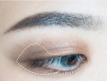 在用深棕色眼影加重晕染眼尾及下眼睑,用刷子上的余粉加重下眼头位置。