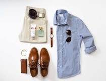浅蓝色衬衫+卡其色长裤+棕色皮鞋。棕色的皮鞋加上墨镜,整体呈现出时尚的商务风。