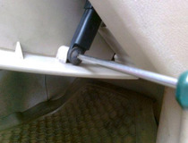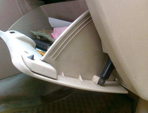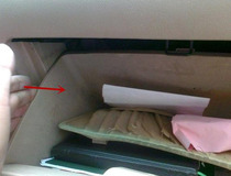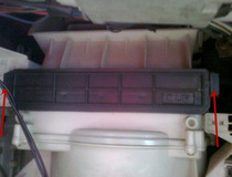 把手套箱卸下,就可以看到空调滤芯盒了,拆空调滤芯盒时把箭头所指的两个卡子位置,一按就出来了。
