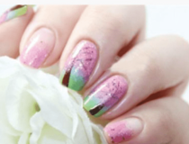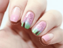 然后又用到小海绵,将粉红色的指甲油涂在小海绵上,再印在指甲的后半段,将其作为印花,三种颜色横向晕染,让浪漫樱花的氛围被烘托出来了。