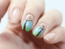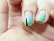 首先将天蓝色和绿色的甲油分别晕染在小海绵上,在纸片上过滤多余的指甲油。
