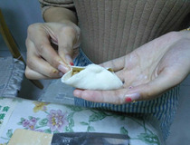 把饺子皮中间处的两个边捏一下,然后从右手边开始捏饺子。