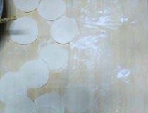 准备好包饺子用的面皮,可以自己擀,也可以买现成的饺子皮。