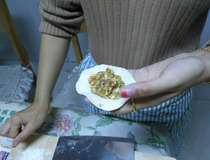 把饺子馅放到饺子皮上,不要放太多,不然包不住。