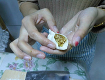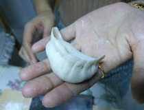 捏边方法是捏一下一个褶,一直往前赶,直到捏完整个饺子边。