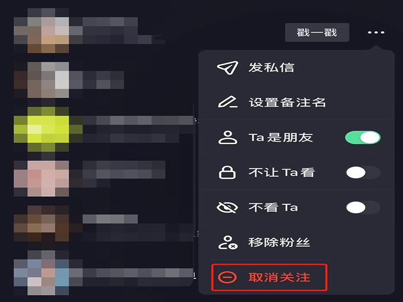 5、在选项功能栏上,选择点击“取消关注”,这样分享视频时取消关注的好友就不会再出现在分享栏中了。