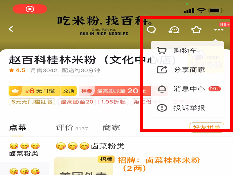 2、进入“商家详情”界面后,打开功能栏,点击“投诉举报”,进入“举报商家”界面。