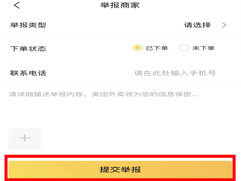 3、进入“举报商家”界面后,填写相关的举报信息,再点击“提交举报”即可。