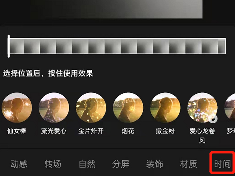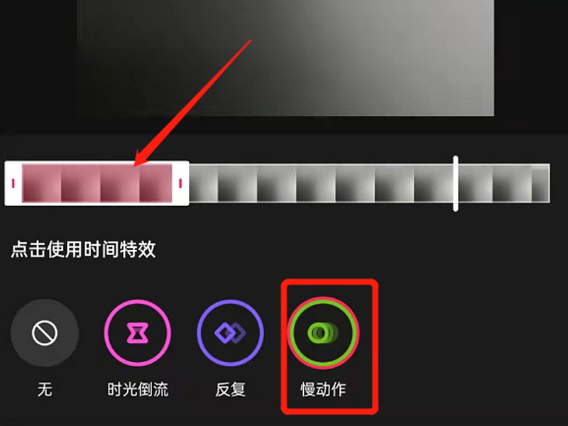 4、点击“慢动作”,即可将视频放慢,拉动上方视频中的控制框,拖到需要放慢镜头的地方即可。