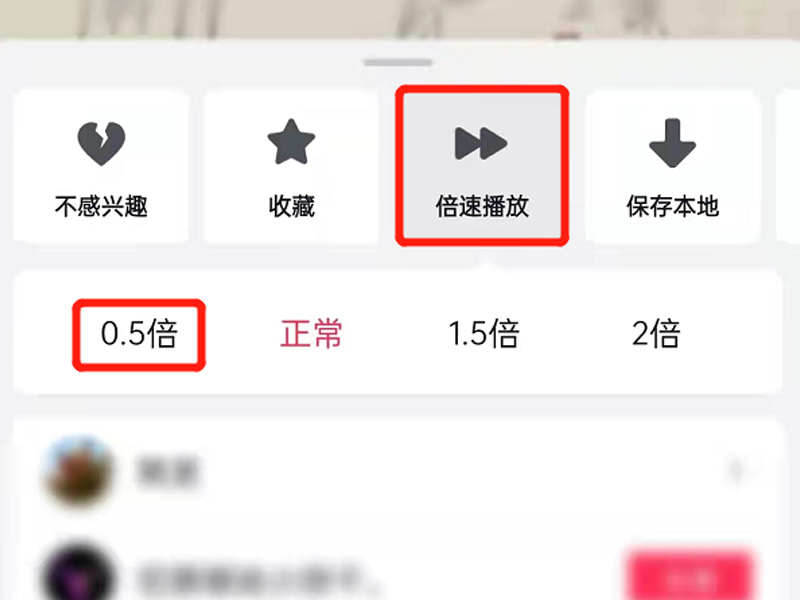 抖音视频播放有四种倍速选择,要设置0.5倍播放,在视频播放中即可直接设置。具体操作方法如下: