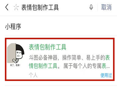 2、点击“搜索小程序”进入搜索小程序页面,搜索“表情包制作工具”显示搜索结果。
