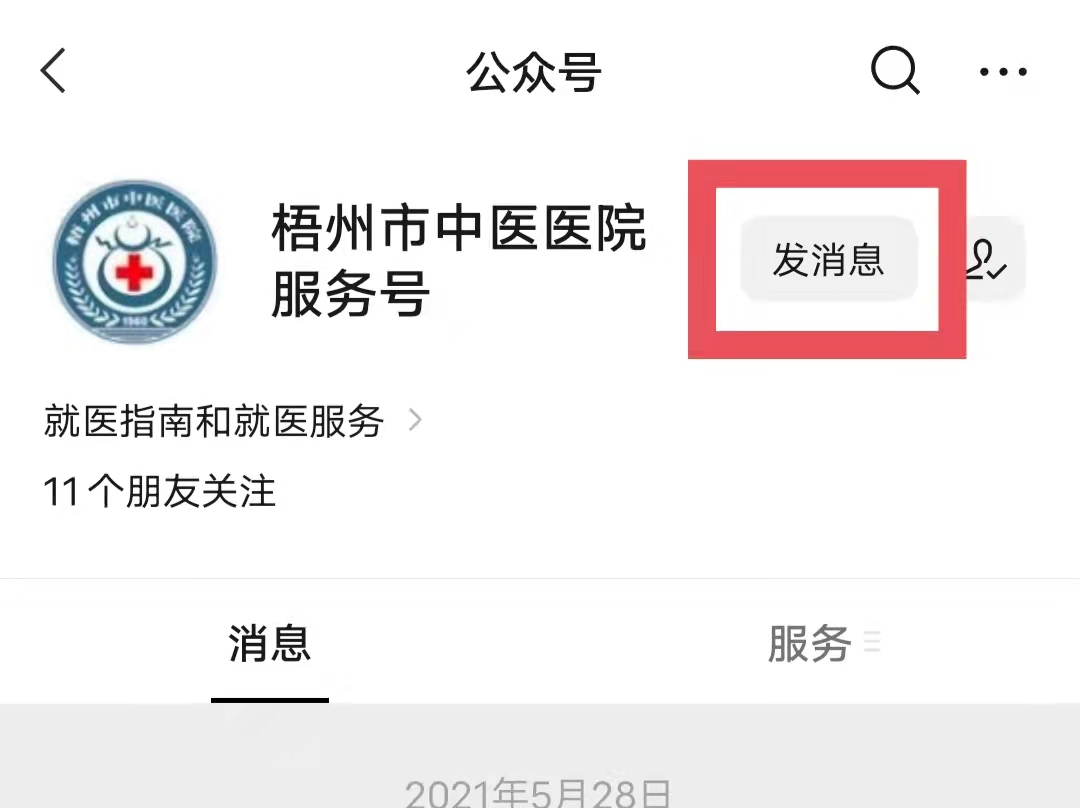 1、打开微信APP,搜索“梧州市中医院公众号”,点击该公众号,再点击“发消息”,进入公众号界面。