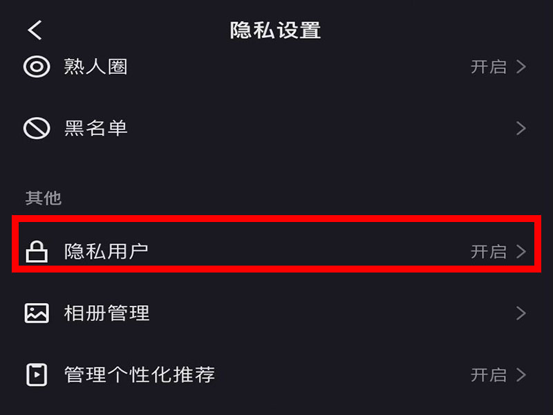 4、进入“隐私设置”界面后,点击将“隐私用户”关闭即可。