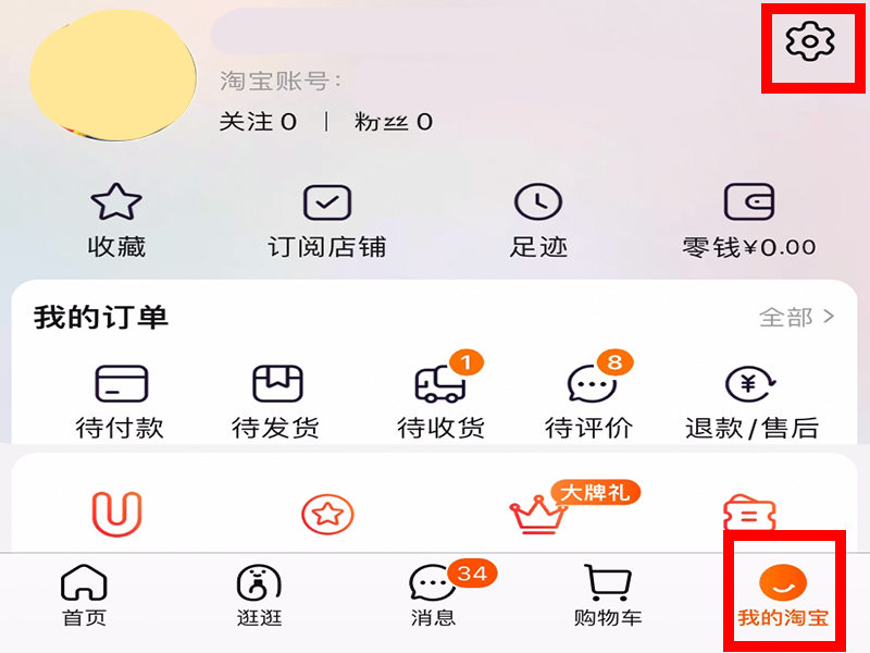 1、打开淘宝,进入“我的淘宝”界面,再点击右上角的“设置”符号,进入“设置”界面。