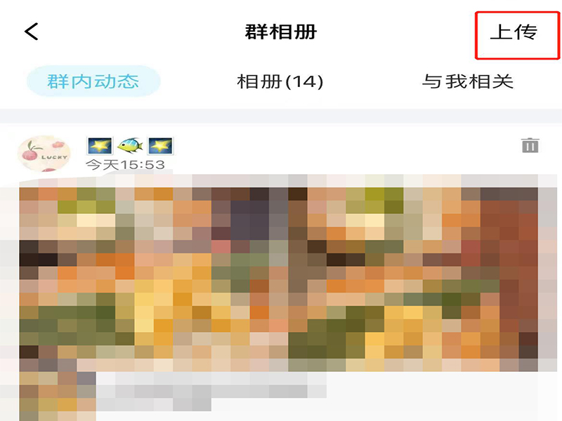 4、在群相册页面上,点击“上传”,选择图片上传至群相册。