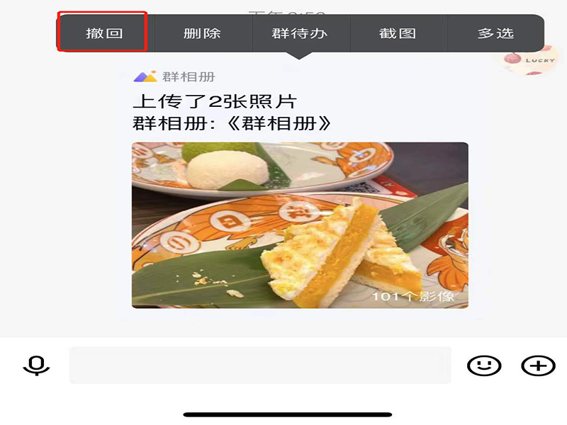 5、上传群相册后,返回至群聊页面,长按上传群相册的信息,并点击“撤回”即可。
