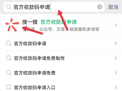 1、打开微信app,在搜索栏中输入“官方收款码申请”,点击“搜一搜”进入页面。