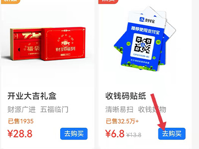 5、在页面中,点击收钱码贴纸下方的“去购买”,完成后等待收货即可获得支付宝收款码。