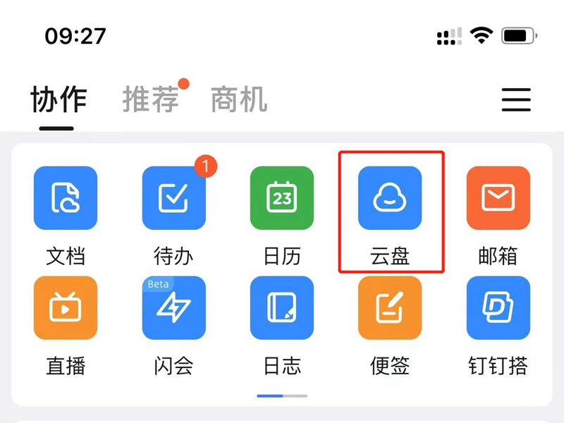 1、打开钉钉app,点击页面下方的协作,选择上方的云盘。