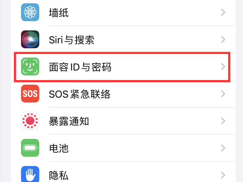1、打开手机的设置,点击“面容ID与密码”的按钮,进入面容ID与密码的设置页面中。
