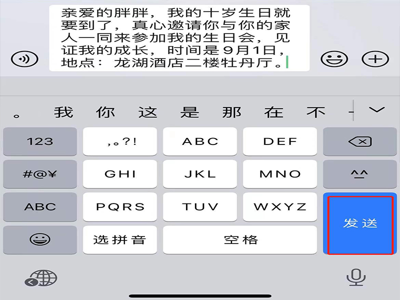 3、在好友聊天页面的输入框中,输入邀请函信息,即可点击“发送”,邀请好友参加生日会。