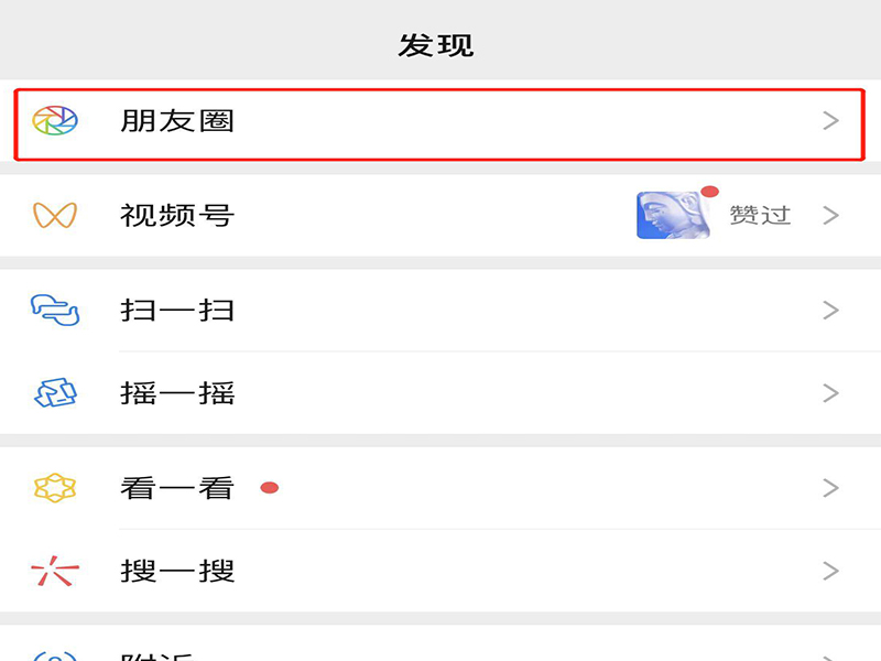 1、打开微信app,在发现页面上,点击“朋友圈”,进入朋友圈页面。