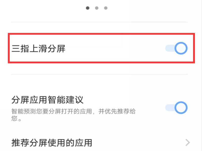 4、把“三指上滑分屏”按钮的开关打开即可。