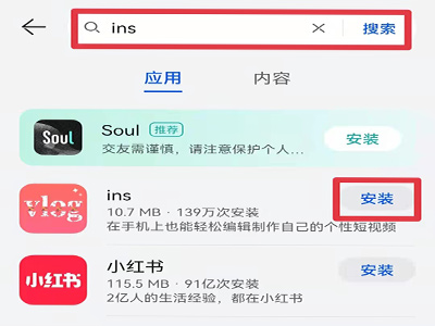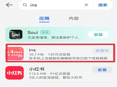3、找到ins软件,点击其右侧的“安装”按钮,待显示“打开”字样,即为下载安装完毕。